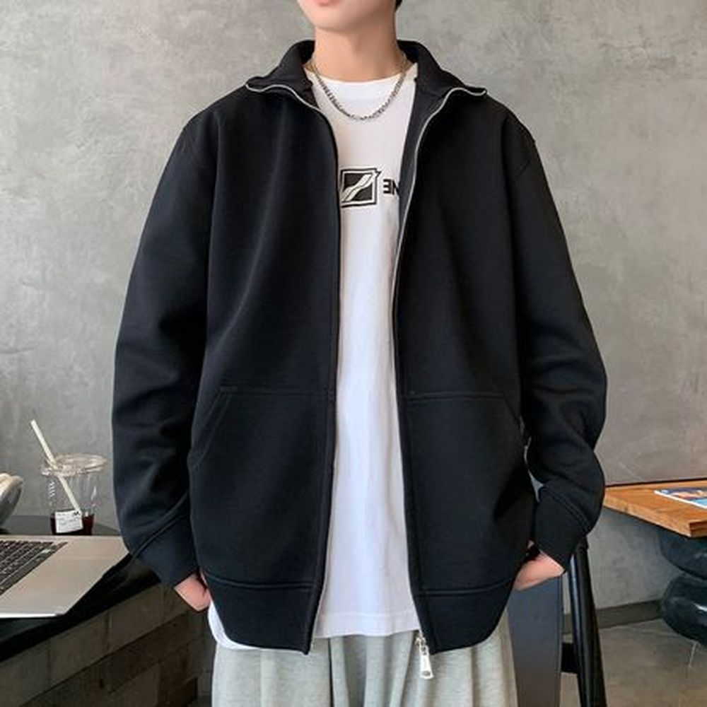 Men's Fleece-lined Black Jacket Oversized Loose-fitting Zip-up Hooded Sweatshirt